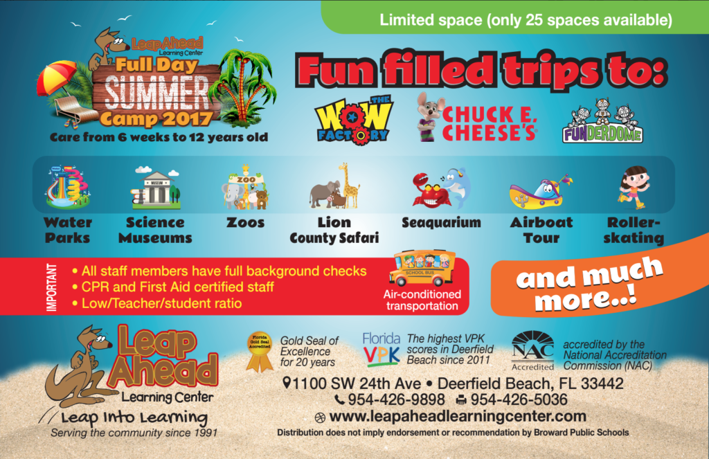 Leap Ahead Learning Center offers summer and winter camps for school age children, age 5-12 years old with exciting field trips and fun-filled activities all day along. Our campers enjoy educational and recreational field trips to museums, parks, zoo, movies, roller-skating, Lion country Safari, Bowling, Splash parks. A snack and breakfast is included with no additional cost. Each day has some new, exciting activity in store for campers. There will be group activities, theme days, picnics, holiday parties and much more. Program themes and activities change from year to year.Be ready to make great friends!